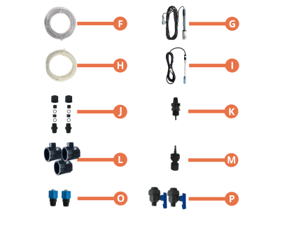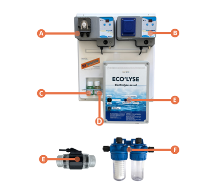 Accessoires inclus : Prise secteur pour branchement de l"électrolyse, 3 colliers de prise en charge en Ø50 mm, 2 x kit d'analyse complet (sonde ph + sonde redox + 2 x solution d'étalonnage), tuyau d'aspiration (1.5M) + filtre, tuyau d'injection (5M) + injecteur, kit de fixation mural.